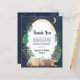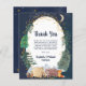 Un carte de remerciements de baby shower rustique abordable avec une jolie illustration d'animaux de bois avec leur tente campant dans les montagnes et la forêt, une superposition d'étoiles dorées et de lune dans un ciel nocturne et le "Merci" et les noms des parents dans un scénario bleu nuit foncé. Ce carte de remerciements fait partie de notre collection de Baby showers Adventure Awaits Woodland Animals.