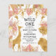 L'invitation baby shower de cette "sauvage" safari dans la jungle à thème de la fille comprend des animaux à fausse feuille d'or (girafe, lion et singes), du feuillage de la jungle dorée et rose, et un arrosage de confettis d'or sur un arrière - plan blanc. Ajoutez le nom de la future maman et les détails de la douche en texte noir. Un cadre de coordination motif de feuilles rose et or apparaît à l'envers.