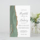 The left-hand edge of this elegant modern wedding invitation features a sage green watercolor agate border trimmed with faux gold glitter. The customizable text combines charcoal gray handwriting, copperplate and italic fonts on a white background. The reverse side features a matching sage green and gold agate design.
