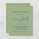 Budget Simple Sage Green Script Mariage Soirée Invitation de soirée. Un prix économique PETIT 4,5 po x 5,6 po alternatif. Disponible dans un STOCK CARTE SEMI GLOSS 110 lb qui est l'option par défaut (recommandé pour les invitations), OU un STOCK PAPIER THINNER SATIN FINISH 80 lb (idéal pour les boîtiers). Les enveloppes sont en option et légèrement plus grandes que la taille de la carte. Définissez l'élégance de style d'écriture manuscrite pour Soirée et le reste du texte que vous pouvez facilement personnaliser. Le texte et les couleurs arrière - plans peuvent être changés à n'importe quel ou à votre choix via l'option customiser plus loin.