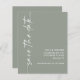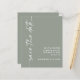 Calligraphie minimaliste QR Code Sage Green Wedding Enregistrer la date. Une alternative de 4,5 x 5,6 po à prix réduit sur 110gsm semi-brillant semblable en épaisseur à une carte postale. Code QR facultatif sur votre site Web mariage à l'arrière qui sera généré automatiquement lorsque vous changez l'exemple d'url sur votre propre URL de site Web ou supprimez un exemple de code si cela n'est pas nécessaire. La calligraphie stylée est pivotée à gauche, avec tous les détails élégamment à droite avec beaucoup d'espace blanc pour une atmosphère contemporaine. Personnalisez facilement avec vos détails. Et changez la couleur du texte et de l'arrière - plan si vous le souhaitez via l'option Modifier plus.