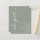 Budget Minimaliste Script Oh Girl Sage Baby shower. Un prix économique PETIT 4,5 po x 5,6 po alternatif. Disponible dans un STOCK de CARTE SEMI GLOSS 110 lb d'épaisseur similaire à une carte postale. Il y a UN par feuille. Style contemporain avec Oh Girl tourné et à gauche et facilement personnaliser le reste du texte à vos propres détails.