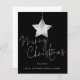 Simple Silver Star Merry Christmas Black Holiday Card. Un prix petit SMALLER 4.5" x 5.6" carte plat pour vos salutations festives sur un stock de carte SEMI GLOSS 110 lb brillant (semblable à l'épaisseur d'une carte postale) S'IL VOUS PLAÎT NOTE : L'enveloppe fournie avec cette carte est légèrement plus grande que la carte elle-même. Style contemporain en noir classique avec un script de style manuscrit moderne pour l'en-tête principal et personnalisez facilement avec votre salutation et les noms en bas. Une illustration en aquarelle argentée est au centre supérieur. Un arrière - plan blanc se trouve à l'arrière, qui peut être changé en une autre couleur si vous le souhaitez via personnaliser plus loin.