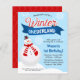 Cute boy hiver onederland thème budget 1er anniversaire invitations. Ce design mignon présente un bonhomme de neige amusant et des flocons de neige en rouge, bleu et blanc élégant.