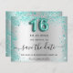 Une fille et tendance Enregistrer la carte Date pour une Sweet 16, 16e anniversaire fête. Un arrière - plan faux argenté décoré de poussière de parties scintillant turquoise et verte. Personnalisez et ajoutez une date et un nom/âge. Le texte : Save the Date est écrit avec un grand script de style à la main tendance. Numéro 16 avec une police de style ballon.