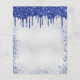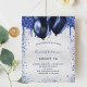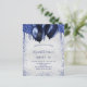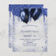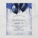 Une invitation à la fête d'anniversaire féminine et féminine. Devant : Un faux arrière - plan argenté. Décoré avec des gouttes de parties scintillant bleu marine, l'apparence de la peinture goutte à goutte et des ballons. Personnalisez et ajoutez un nom et des détails du parti. Le nom est écrit avec un script de style écrit à la main.