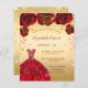 Une invitation moderne, élégante et glamour pour une fête Sweet 16, 16e anniversaire. Un arrière - plan en faux or avec de la poussière de parties scintillant en faux or, une robe et des roses rouges, des fleurs. Le nom est écrit avec un script de style moderne écrit à la main. Personnalisez et ajoutez les détails de votre fête.