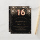 Une invitation moderne, élégante et glamour pour une soirée Sweet 16, 16e anniversaire de fille. Un arrière - plan noir décoré de faux parties scintillant. Le nom est écrit avec un script de style à la main de couleur dorée moderne. Personnalisez et ajoutez les détails de votre fête. Le numéro 16 est écrit avec une police de style ballon, script.