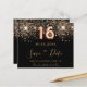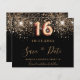 Une fille et tendance Enregistrer la date pour une Sweet 16, 16e fête d'anniversaire. Un arrière - plan noir décoré de parties scintillant en faux or. Modèles pour une date, un nom et un texte. Lettres de couleur dorée. Le texte : Save the Date est écrit avec un grand script de style à la main tendance.