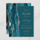 The left-hand edge of this elegant modern wedding invitation features a teal watercolor agate border trimmed with faux rose gold glitter. The customizable text combines rose pink handwriting, copperplate and italic fonts on a teal blue background. The reverse side features a matching teal and rose gold agate design.