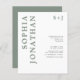 Budget All in One avec détails Typographie moderne Gras Sage Vert tendance Monogramme Faire-part de mariage... Notre faire-part de mariage verte "All in One" à prix abordable est dotée d'une typographie serif audacieuse combinée à un texte sans serif pour un faire-part de mariage monogrammé simple et tendance. Le verso de l'invitation contient tous les détails que vous verriez habituellement sur des cartes séparées dans le paquet mariage, y compris l'heure et le lieu de réception, les options d'hébergement, le site Web du mariage, le RSVP et les informations sur le registre. Cette faire-part de mariage de style moderne a été conçue pour être à la fois branchée et économique... sans parler des économies de temps. Tous les exemples de texte peuvent être facilement révisés avec vos propres informations sur le modèle de personnalisation. Remarque : vous avez la possibilité d'acheter des enveloppes avec vos invitations ou de vous approvisionner, si vous avez un fournisseur de produits papier préféré.