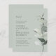Budget Tout en un Eucalyptus Botanical Sage Faire-part de mariage... Notre faire-part de mariage botanique abordable "All in One" présente une branche d'eucalyptus à l'aquarelle élégante dans des tons de sauge et de vert poussiéreux en partant du texte de l'invitation à côté. Le bas de l'invitation contient tous les détails que vous verriez généralement sur des cartes séparées dans le paquet mariage. Cette faire-part de mariage moderne à l'avant et à l'arrière a été conçue pour être à la fois élégante et économique... sans parler des économies de temps. Il y a également un modèle graphique de code QR que vous pouvez remplacer par votre propre code (ou supprimer si vous n'avez pas l'intention d'en utiliser un). Tous les exemples de texte peuvent être facilement révisés avec vos propres informations sur le modèle de personnalisation. Tout cela en un budget est également disponible sur une carte de faire-part de mariage traditionnelle 5x7.