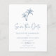 Ce mariage économique, sauf la carte datation, a un design simple et minimaliste sur la plage tropicale avec deux palmiers en haut, dans un jeu de couleurs blanc et bleu poussiéreux, avec un modèle photo à l'arrière.