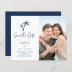 Cet élégant mariage de plage tropicale bleu marine BUDGET enregistrer la carte de date comporte deux palmiers au-dessus du texte, script d'écriture élégante pour le faire-part "Save the Date", et une photo du couple heureux.