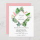 Budget Tropical Green Palm Feuilles et Blush Pink Flowers Aquarelle avec Faux Rose Gold Foil Forme géométrique Printemps ou été Mariage Invitations - comprend une belle et élégante typographie script avec des fleurs botaniques tropicales modernes et la verdure pour la célébration spéciale de mariage.