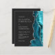 Le bord droit de cette élégante faire-part de mariage moderne est doté d'une bordure turquoise en aquarelle bleue ornée d'une parties scintillant en faux argent. Le texte personnalisable combine les polices argentées grises serif, copperplate et italique sur un arrière - plan noir ardoise. L'envers offre de l'espace pour les détails mariages sur un arrière - plan noir en ardoise solide, ainsi qu'un code QR que les clients peuvent scanner pour visiter votre site Web et RSVP, ce qui permet d'économiser le coût d'impression et d'envoi de cartes RSVP séparées.