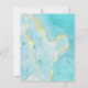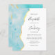 The left-hand edge of this elegant modern wedding invitation features an aqua blue watercolor agate border trimmed with faux gold foil. The customizable text combines handwriting, copperplate and italic fonts in charcoal gray on a white background. The reverse side features a matching aqua and gold watercolor agate design.