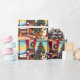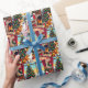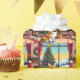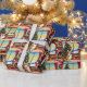 An adorable Christmas gift wrap with a festive Corgi sitting in front of the fireplace on a cold winter day. A Christmas tree decorated and a festive background.