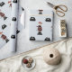 Le papier d'emballage de pirate amusant sera certainement le paquet d'anniversaire préféré de votre petit! Le pirate porte une chemise rayée rouge et noire, un pantalon marron, des bottes de pirate et un bandana rouge. Son couteau est à ses côtés à travers sa ceinture. Entre les motifs de pirates sont des casquettes pirates avec des os croisés sur eux. L'Arrière - plan est bleu pâle.
