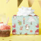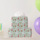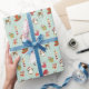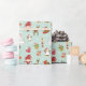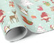 Papier enveloppant avec un pot pourri d'images de Noël telles que le panneau du pôle nord ; pingouins aux casquettes rouges ; cadeaux rouges et verts ; rennes ; arbres de Noël blancs décorés de casquettes rouges ; ornements cardiaques ; beaux casquettes rouges ; et même un Père Noël vintage dans son costume et casquette joyeux rouge. Le tout sur un bateau de mer, arrière - plan vert clair.