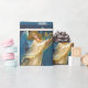 peinture vintage d'un ange avec l'expression angélique, la belle robe débordante et l'harpe d'or dans les bleus et le beige.