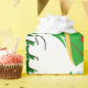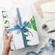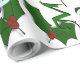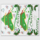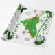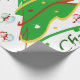 Ce design est orné d'un arbre de Noël vert avec des rubans rouges, dorés et blancs et des boules de Noël ornant l'arbre. Les neigeurs et les saints décorent ce design. "Joyeux Noël" est imprimé sur ce dessin en vert et blanc. Ce papier d'emballage est disponible dans des styles assortis et des coins et bordures colorés.