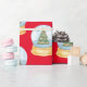 Un emballage cadeau de vacances festif présente des boules de neige motif d'aquarelle avec sapin de Noël sur arrière - plan rouge.