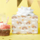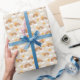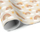 Ce papier d'emballage a une dispersion de chaud, doré, soleils, nuages blancs et trois rainbows rayés de terre cuite rouge, marron et grige pour un motif bohème neutre et heureux, parfait pour des baby showers ou des fêtes d'anniversaire neutres.