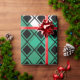 Ce papier d'emballage a un design moderne du milieu du siècle de diamants noirs solides à l'intérieur des contours de diamants noirs avec des triangles dans les nuances de vert de mer sous eux, le tout sur un champ de blanc.