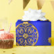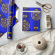 Un enveloppement de Noël décoratif avec un motif de décorations de Noël dorées sur un arrière - plan bleu métallique et coloré pour ajouter une touche sophistiquée et festive à votre cadeau enveloppant cette période de fêtes.