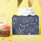Ce papier d'emballage présente un beau motif de ville d'hiver aux couleurs bleu et or.