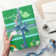 Enveloppez vos cadeaux dans un style adorable avec ce joli papier cadeau pour bébé dinosaure. Le papier d'emballage a un motif de bébés dinosaures et de mignons papillons pourpres (et un bébé dinosaure est même en train de s'échauffer de sa coquille !). Dans la motif, on trouve également des palmiers, des arcs-en-ciel et des soleils. Personnalisez l'emballage cadeau avec le prénom de votre fils ou de votre fille.