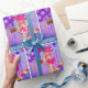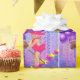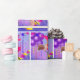 Petit bébé cowgirl à cheval à cheval bâton papier d'emballage cadeau. L'arrière - plan est violet avec des ballons. des serpentins et des étoiles. Cette conception est disponible sur d'autres fournitures de parties.
