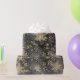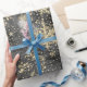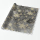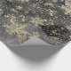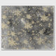 Un papier d'emballage de vacances neutre dans un ton noir et blanc avec une aquarelle peinte ciel de crépuscule arrière - plan avec des baies d'or peintes sur les branches sous une chute de neige dorée et des flocons d'or surdimensionnés.