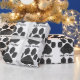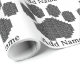 Empreinte de patte de chien de dessin en noir. Bâtiments formant une patte de chien avec effet 3D. Roulettes de papier d'emballage cadeau personnalisées. Bon pour la décoration de fête. Modifiez le nom pour customiser. Idée d'enveloppement cadeau pour amoureux de les chiens.