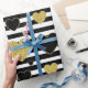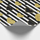 Bold black and white stripe pattern wrapping paper accented with luxe gold-style hearts for a chic, romantic look. A high-contrast design with a modern glam mood.