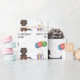 Un joli thème d'anniversaire avec l'illustration originale de Destei d'un mignon chien de race Cavalier King Charles Spaniel de couleur noire et bronzée. A côté du chien il y a des ballons colorés d'anniversaire attachés sur un os de chien et une boîte cadeau de couleur violet et jaune. L'arrière - plan a un motif ludique de confettis pastel colorés sur un arrière - plan blanc. Vous trouverez également une zone de texte personnalisable.