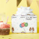 Design à thème d'anniversaire mignon avec le dessin original de Destei illustrant une jolie couleur blenheim Cavalier King Charles Spaniel race dog. A côté du chien il y a des ballons colorés d'anniversaire attachés sur un os de chien et une boîte cadeau de couleur violet et jaune. L'arrière - plan a un motif ludique de confettis pastel colorés sur un arrière - plan blanc. Vous trouverez également une zone de texte personnalisable.