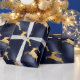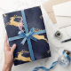 Un papier d'emballage festif et coloré de Noël bleu et or avec un motif de rennes d'or sur un brillant arrière - plan bleu. Parfait pour tous vos cadeaux de vacances enveloppant a besoin de cette saison festive. Prenez la vôtre aujourd'hui !