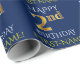 Ce design papier d'emballage comporte un message comme "HAPPY 2nd BIRTHDAY", avec le "2nd" ayant une apparence fausse/imitation or. Il porte également un nom personnalisé et un arrière - plan de couleur bleue. Il pourrait peut-être être utilisé pour envelopper les cadeaux donnés pour le deuxième anniversaire de quelqu’un. [~Z0000135]