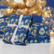 Belle fête d'anniversaire Renaissance Faire papier enveloppant avec un chevalier sur un cheval à côté d'un château bleu du moyen âge. Un emballage cadeau pour enfant cool personnalisé pour un petit prince garçon qui aime les héros d'imaginaires de l'époque ancienne.