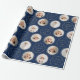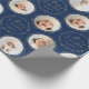 Christmas gift wrapping paper feature modern Merry Christmas script and botanical leaves wreaths, with personalized family name and 6 photos in navy blue and gold, simple and elegant.
