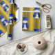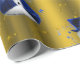 Un joli papier d'emballage de Noël en or coloré avec un motif de petits bonhomme de neige habillé de chapeaux et de gilets en velours bleu, entouré d'étoiles dorées pour donner à votre cadeau d'envelopper cette saison de vacances une touche fantaisiste et élégante.