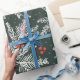 Branches de sapin blanc mignons et étoiles dorées, pois bleus et guimauve rouge sur arrière - plan noir. Modèle papier d'emballage personnalisable