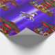 Un papier d'emballage de Noël coloré avec un carrousel vintage et des chevaux de carrousel pour ajouter une touche rétro et une atmosphère de carnaval à votre emballage cadeau de Noël et cadeaux cette saison de fêtes. Le design est composé d'un motif de carrousels vert et rose avec des chevaux en bois colorés, entourés de chevaux peints en marron et blanc qui dansent autour d'eux, avec des sentiers d'étoiles de Noël roses sur l'arrière - plan bleu dégradé