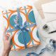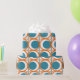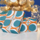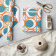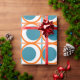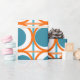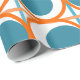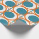 Ce papier d'emballage a un design moderne du milieu du siècle de cercles orange ouvert avec des cercles turquoises solides qui traversent le motif avec des lignes verticales turquoises et des lignes horizontales orange.