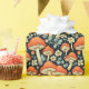 Emballage cadeau avec une illustration de champignons rétro, fleurs vintages aux couleurs vintages de bleu foncé, orange et beige.