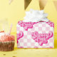 Style de police rétro rose et rose chaud "Super One" typographie contre un papier d'emballage motif de damier rose et blanc clair. Ce papier d'emballage est créé pour une collection de premier anniversaire. Enveloppe cadeau spécial pour le 1er anniversaire de votre fille.