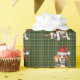 Une adorable aquarelle illustrant un chien Beagle, se marie avec un arrière - plan à motifs plaid de saison vert, et le chien porte un casquette de vacances festif.