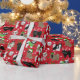 Chiens Tzu Chih de Noël mignons aux couleurs noir, blanc, gris, or et masque, habillés de tenues de vacances festives, chapeaux de Père Noël et chandails de Jacquard avec motif parsemé d'ornements de Noël.